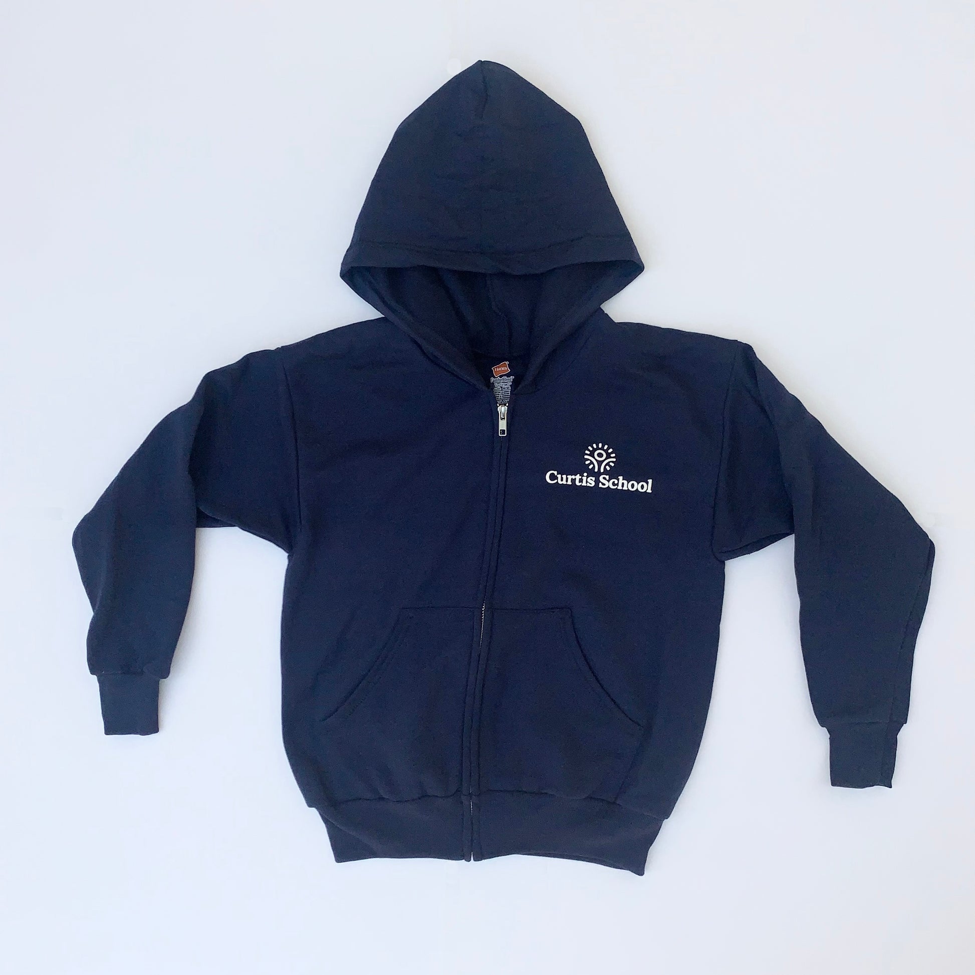 Hanes Comfort Blend hoodies with dual pockets and a front zipper. Comes in Navy with our new Curtis logo on upper left hand side.